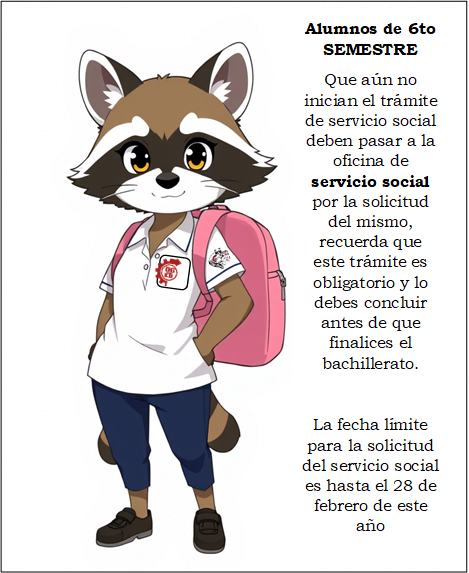 Que aún no inician el trámite de servicio social deben pasar a la oficina de servicio social por la solicitud del mismo, recuerda que este trámite es obligatorio y lo debes concluir antes de que finalices el bachillerato.