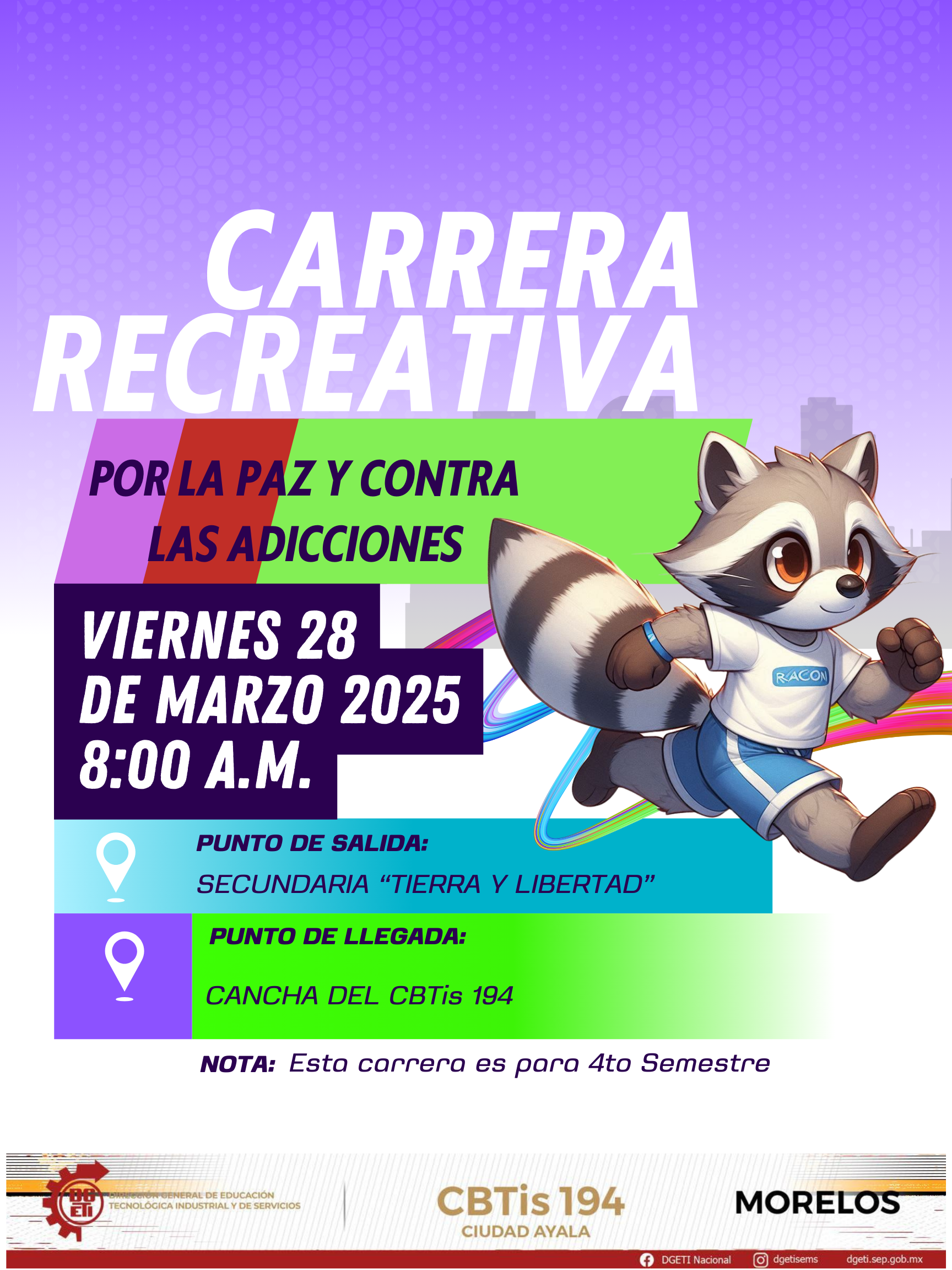 Por medio de la presente se hace de su conocimiento que los alumnos de cuarto semestre realizarán una carrera atlética por la paz y contra las adicciones, el día viernes 28 de marzo, se reunirán a las 8:00 a.m, en la secundaria de la tierra y libertad, después de la actividad se retiraran a sus hogares. No habrá clases únicamente para alumnos de cuarto semestre de ambos turnos.