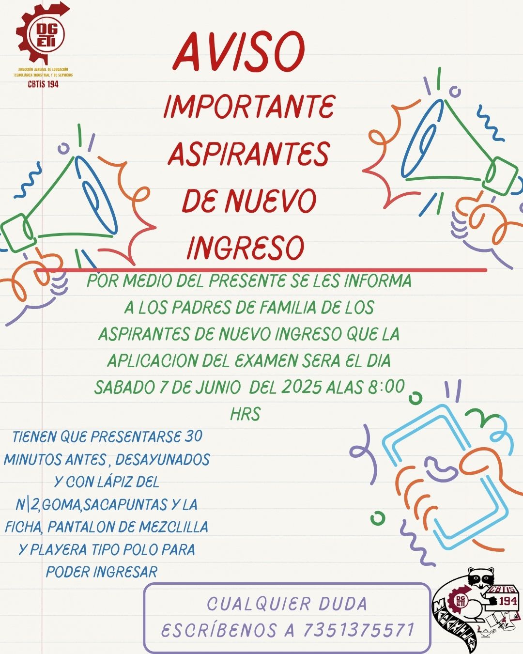 El ingreso a las instalaciones del plantel será a partir de las 7:15 a.m. El examen comenzará puntualmente a las 8:00 a.m.